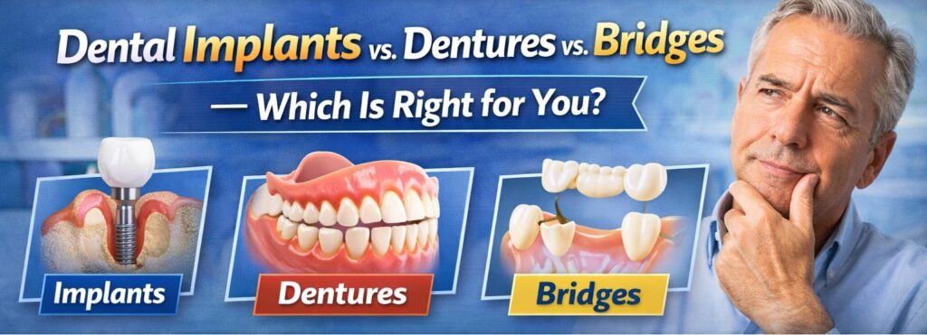 Losing a tooth is not just a cosmetic problem. Missing teeth affect how you chew, speak, and feel about your smile — and they can lead to bone loss and shifting of neighbouring teeth if left untreated. At Dental Mid World, Midnapore, Dr. Somnath Pal offers three proven options for replacing missing teeth: dental implants, dental bridges, and dentures. Here is how to choose the right one.
